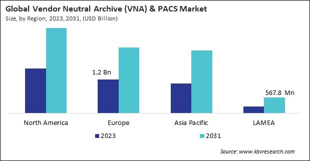The North America region dominated the Global Vendor Neutral Archive (VNA) & PACS Market by Region in 2023, and would continue to be a dominant market till 2031; thereby, achieving a market value of $3.1 billion by 2031. The Europe region is anticipated to grow at a CAGR of 8.9% during (2024 - 2031). Additionally, The Asia Pacific region would witness a CAGR of 10.2% during (2024 - 2031).