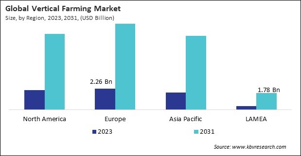 The Europe region dominated the Global Vertical Farming Market by Region in 2023, and would continue to be a dominant market till 2031; thereby, achieving a market value of $9.2 billion by 2031. The North America region is experiencing a CAGR of 18.9% during (2024 - 2031). Additionally, The Asia Pacific region would exhibit a CAGR of 20.2% during (2024 - 2031).