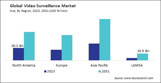 The Asia Pacific region dominated the Global Video Surveillance Market by Region in 2023; thereby, achieving a market value of $67.01 billion by 2031. The North America region would capture a CAGR of 11.6% during (2024 - 2031). Additionally, The Europe region is expected to witness a CAGR of 12% during (2024 - 2031).