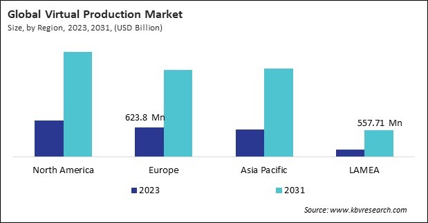 The North America region dominated the Global Virtual Production Market by Region in 2023, thereby, achieving a market value of $2.24 billion by 2031. The Europe region is anticipated to grow a CAGR of 14.8% during (2024 - 2031). Additionally, The Asia Pacific region would witness a CAGR of 16.1% during (2024 - 2031).