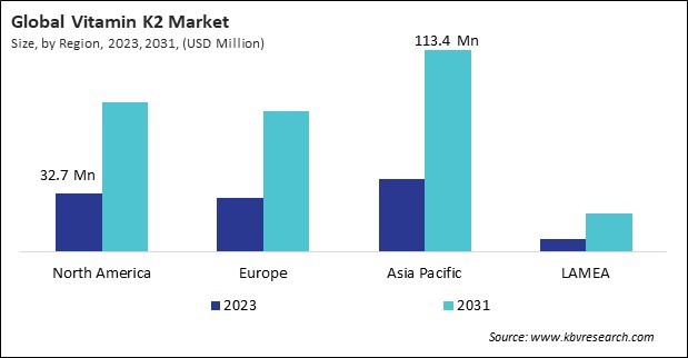 The Asia Pacific region dominated the Global Vitamin K2 Market by Region in 2023, and would continue to be a dominant market till 2031; thereby, achieving a market value of $113.3 million by 2031. The North America region is exhibiting a CAGR of 12.6% during (2024 - 2031). Additionally, The Europe region would experience a CAGR of 12.9% during (2024 - 2031).