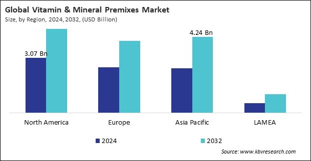 The North America region dominated the Global Vitamin & Mineral Premixes Market by Region in 2024, and would continue to be a dominant market till 2032; thereby, achieving a market value of $4.6 billion by 2032. The Europe region is experiencing a CAGR of 6% during (2025 - 2032). Additionally, The Asia Pacific region would exhibit a CAGR of 7.1% during (2025 - 2032).