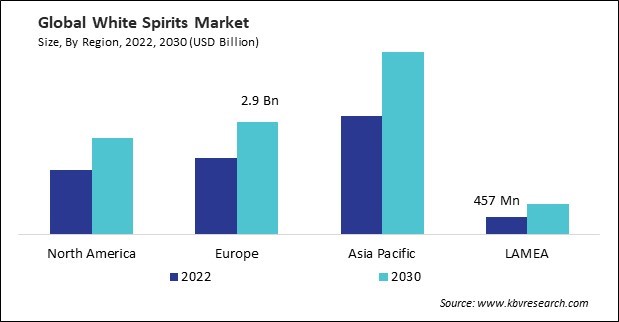 The Asia Pacific region dominated the Global White Spirits Market by Region in 2022 and would continue to be a dominant market till 2030; thereby, achieving a market value of $4.8 billion by 2030. The Europe region is experiencing a CAGR of 5.1% during (2023 - 2030). Additionally, The North America region would exhibit a CAGR of 5.3% during (2023 - 2030).