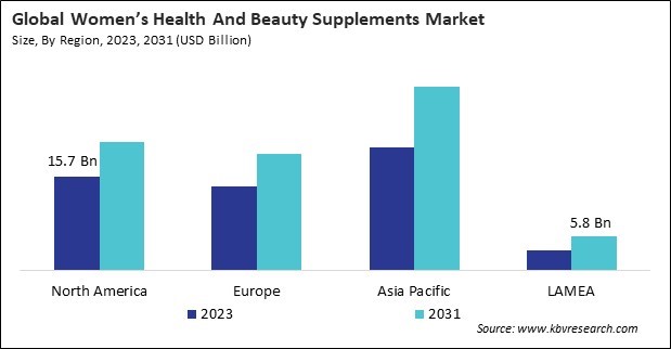 The Asia Pacific region dominated the Global Women’s Health And Beauty Supplements Market by Region in 2023, and would continue to be a dominant market till 2031; thereby, achieving a market value of $30.9 billion by 2031. The North America region is showcasing a CAGR of 4.2% during (2024 - 2031). Additionally, The Europe region would exhibit a CAGR of 4.5% during (2024 - 2031).