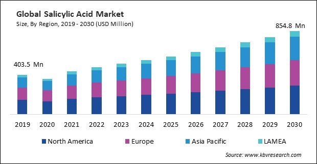 The Global Salicylic Acid Market size is expected to reach $854.8 billion by 2030, rising at a market growth of 7.4% CAGR during the forecast period. In the year 2022, the market attained a volume of 1,46,668.82 tonnes, experiencing a growth of 6.6% (2019-2022).