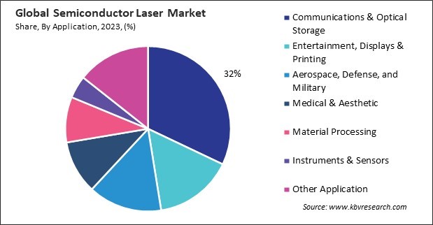 On the basis of application, the market is classified into medial & aesthetic, instruments & sensors, aerospace, defense, & military, material processing, communications & optical storage, entertainment, displays & printing, and others. The entertainment, displays & printing segment witnessed 15% revenue share in the market in 2023. Laser-based technologies have become popular in applications like laser projectors, displays, and high-quality printing systems.