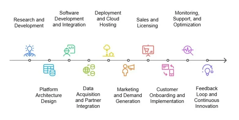 The image outlines a comprehensive value chain for Social Business Intelligence (SBI) solutions, showcasing the complete lifecycle from product design to client success. It begins with Product Design & Development, where analytics platforms are conceptualized and built. Data Sourcing & Ingestion ensures continuous data flow by connecting to social media APIs, while the Data Processing & Analytics Engine transforms this raw data into actionable insights. These insights are then delivered through Platform Integration & UX Delivery, ensuring an intuitive user experience. The chain continues with Sales & Marketsing to engage businesses, followed by Implementation & Customization for smooth onboarding. Customer Training & Enablement equips users with knowledge to maximize value, supported by Technical Support & Maintenance to address issues and updates. Finally, Customer Success & Analytics Optimization and Upgrades & Renewal ensure clients achieve their goals and benefit from ongoing enhancements and flexible contracts.