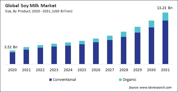 The Global Soy Milk Market size is expected to reach $13.23 billion by 2031, rising at a market growth of 13.2% CAGR during the forecast period. In the year 2023, the market attained a volume of 1,724.36 kilo tonnes, experiencing a growth of 11.9% (2020-2023).