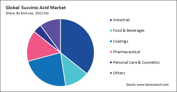 Based on end-use, the market is fragmented into food & beverages, pharmaceutical, coatings, industrial, personal care & cosmetics, and others. In 2022, the industrial segment held the highest revenue share in the market. A significant amount of this market can be ascribed to the expanding utilization of products, including tetrahydrofuran, 1,4-butanediol (BDO), and polyurethane in diverse sectors that rely on succinic acid as their principal raw material. BDO synthesizes tetrahydrofuran, a substantial raw material in spandex production and a crucial solvent in the chemical industry. Spandex possesses remarkable strength and elasticity. The expansion of this sector is expected to be aided by the high demand for this material.