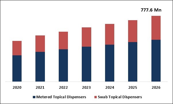 The Global Topical Dispenser Market size is expected to reach $777.6 Million by 2026, rising at a market growth of 8.3% CAGR during the forecast period. Topical applicators are mainly utilized for topical medications that are applied to body surfaces. These applicators can be easily used on ailments such as creams, gels, foams, lotions, and ointments for skin treatment. With the help of topical applicators, cream, or gel application becomes easy and contactless. The Topical applicators are specifically categorized into two forms: metered or swab type. The metered topical applicators make sure that the metered dosage provides optimum provider efficiency and patient comfort of use.
