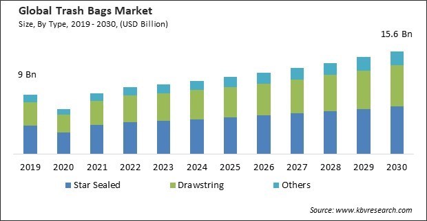 The need for efficient waste containment and disposal solutions has a multifaceted impact on the demand for these bags. Factors such as hygiene, environmental sustainability, waste segregation, and regulatory compliance contribute to the continued growth and diversification of the market as a critical component of effective waste management systems. Additionally, growing environmental awareness drives consumers to seek eco-conscious trash bags made from biodegradable, compostable, or recycled materials. Increased knowledge about environmental issues encourages consumers to choose products that minimize environmental impact, leading to a shift in demand toward sustainable trash bags. The expanding awareness of environmental issues is anticipated to contribute to a heightened demand for eco-friendly bags, which would cater to consumers' inclination towards purchasing products that reflect their ecological principles. Hence, the rising concerns about the environment are propelling the growth of the market.