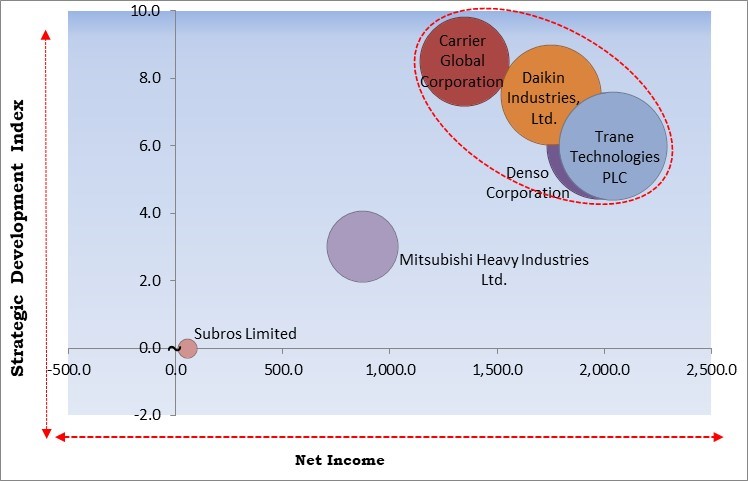 Based on the Analysis presented in the KBV Cardinal matrix; Denso Corporation, Carrier Global Corporation, Daikin Industries, Ltd., Trane Technologies PLC are the forerunners in the Market. For Instance, In September, 2023, Denso Corporation has launched Everycool, an advanced cooling system that provides comfort and energy efficiency when a commercial vehicle’s engine is off. Through this launch, the company will improve driver working conditions during hot summer seasons, reduce environmental impact, and promote efficient energy utilization by lowering fuel consumption. Companies such as Mitsubishi Heavy Industries Ltd., Subros Limited are some of the key innovators in Market.