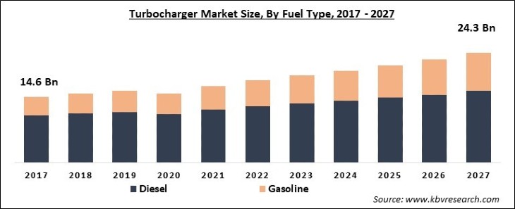 The Global Turbocharger Market size is expected to reach $24.3 billion by 2027, rising at a market growth of 6.2% CAGR during the forecast period. A turbocharger is a device that is turbine-driven, which helps in increasing the internal combustion engine's power output by offering extra compressed air into the combustion chamber. In addition, a turbocharger is different from the conventional aspirated engine's power output as the compressor is able to force more air and respectively more fuel into the combustion chamber than atmospheric pressure itself. There is a wide range of applications of these turbochargers, generally in the car, truck, aircraft, train, and construction-equipment engines. These turbochargers are mostly utilized with Otto cycle & diesel cycle internal combustion engines.