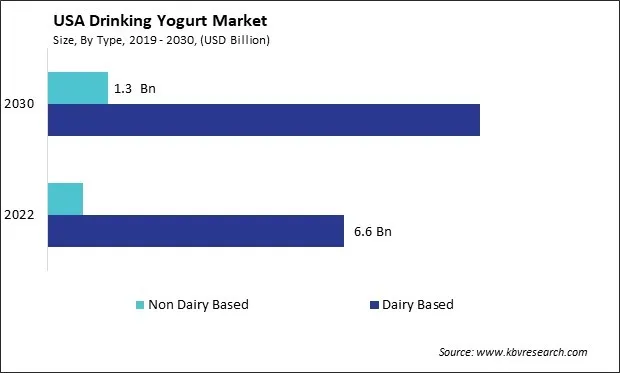 The USA Drinking Yogurt Market size is expected to reach $10.9 Billion by 2030, rising at a market growth of 5.2% CAGR during the forecast period. In the year 2022, the market attained a volume of 926.8 million litres, experiencing a growth of 5.3% (2019-2022).
