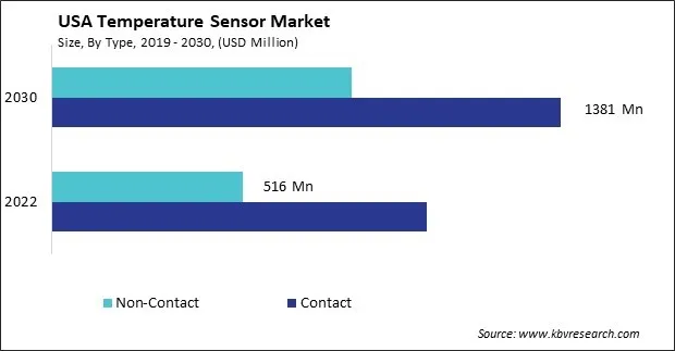 According to CMS.gov, U.S. healthcare spending experienced a 4.1 percent growth in 2022, reaching a staggering $4.5 trillion, equivalent to $13,493 per person. This expenditure constituted 17.3 percent of the nation's Gross Domestic Product. Shifting gears to the temperature sensor market in the U.S. reflects a parallel trajectory of expansion and prominence, mirroring the upward trend observed in healthcare spending. As the healthcare sector continues to prioritize patient well-being and regulatory standards, the temperature sensor market in the United States is expected to witness sustained growth, with innovations in sensor technologies addressing the evolving needs of the healthcare industry.