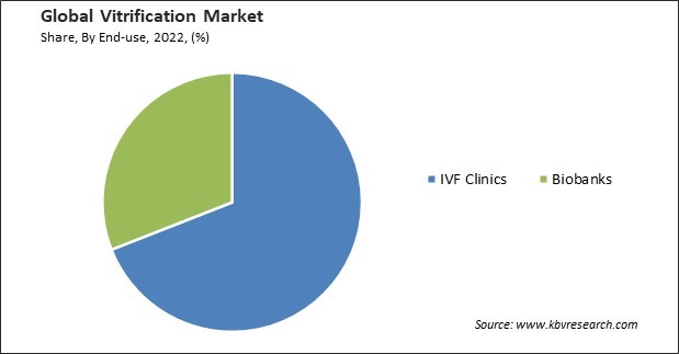 Based on end-use, the market is fragmented into IVF clinics and biobanks. In 2022, the IVF clinics segment witnessed the largest revenue share in the market. The significant revenue share may result from the growing number of IVF clinics that provide vitrification and other ART services. Furthermore, the clinics are providing services like sperm, egg, and oocyte storage, which is anticipated to increase the income share of clinics. Regarding the IVF progress rate and the number of freezing cycles for oocytes and embryos, the vitrification technique considerably enhances the reproductive health environment.