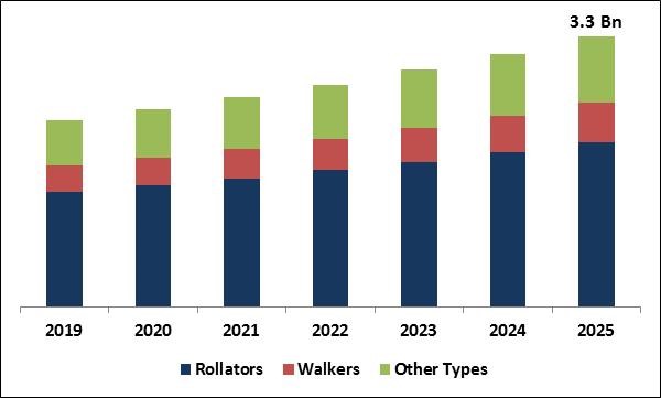 The Global Walking Aids Market size is expected to reach $3.3 Billion by 2025, rising at a market growth of 6.4% CAGR during the forecast period. Walking aids are tools that allow people with disabilities to walk or improve mobility. Walking aids are also known as ambulatory aids. Multiple categories of walking sticks are available on the market, including canes, crutches, and walkers. Various types of canes, like white canes, quad canes, and forearm canes, are available across the market. White canes are designed specifically for visually impaired people, allowing them to detect objects in their path.