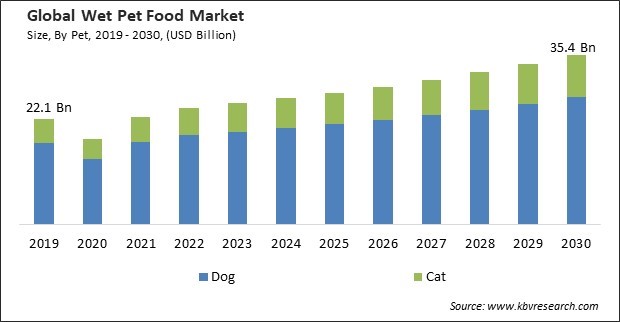 The Global Wet Pet Food Market size is expected to reach $35.4 billion by 2030, rising at a market growth of 4.9% CAGR during the forecast period. In the year 2022, the market attained a volume of 3467.8 Kilo Tonnes experiencing a growth of 2.0% (2019-2022).