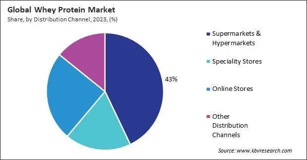 Based on distribution channel, the market is classified into supermarkets & hypermarkets, specialty stores, online stores, and others. The supermarkets & hypermarkets segment garnered 43% revenue share in the market in 2023. In tonnes of volume, 112,747.1 tonnes of whey protein is expected to be sold in supermarkets and hypermarkets by the year 2031. The supermarkets and hypermarkets segment benefits from its ability to offer a wide variety of whey protein products under one roof, providing convenience and accessibility to consumers.